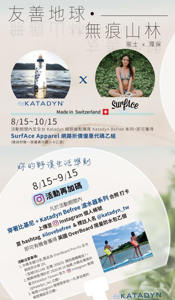 友善地球。無痕山林 KATADYN BeFree濾水器XSurfAce Apparel 有機會獲得☆英國OverBoard限量防水包 |